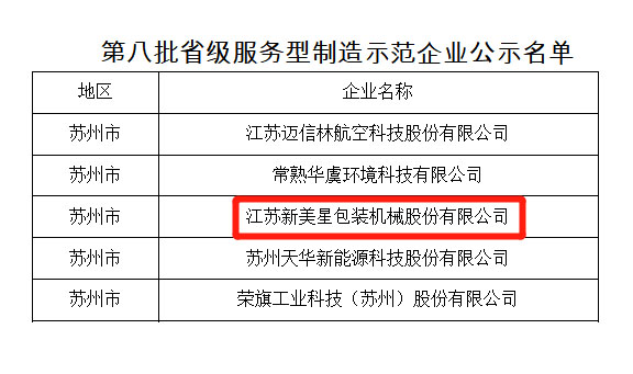 近日,省工信廳公示了第八批江蘇省服務型制造示范企業(yè)(平臺)名單。新美星經過一系列推薦、評選、考核等程序,成功獲評,光榮上榜。