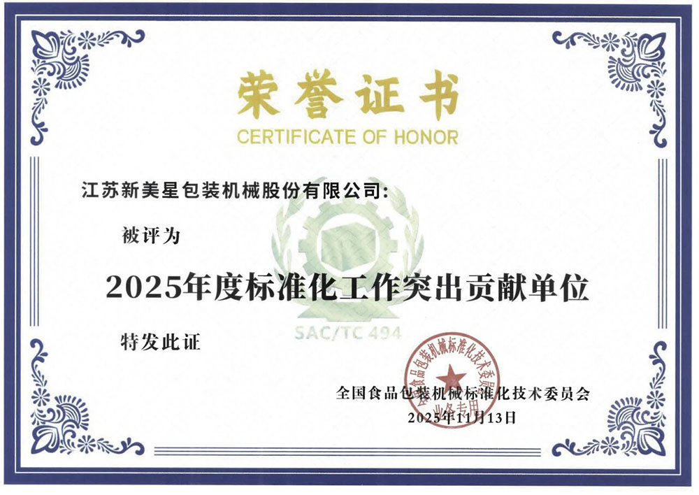 近日,全國(guó)包裝機(jī)械標(biāo)準(zhǔn)化技術(shù)委員會(huì)、全國(guó)食品包裝機(jī)械標(biāo)準(zhǔn)化技術(shù)委員會(huì)2025年年會(huì)暨標(biāo)準(zhǔn)審查會(huì)在廣東肇慶召開。會(huì)議期間,新美星被授予“2025年度標(biāo)準(zhǔn)化工作突出貢獻(xiàn)單位”“2025年度國(guó)際標(biāo)準(zhǔn)化工作突出貢獻(xiàn)單位”等榮譽(yù)稱號(hào),同時(shí)獲頒“國(guó)家標(biāo)準(zhǔn)外文版牽頭制定單位證書”,星光璀璨,備受矚目。